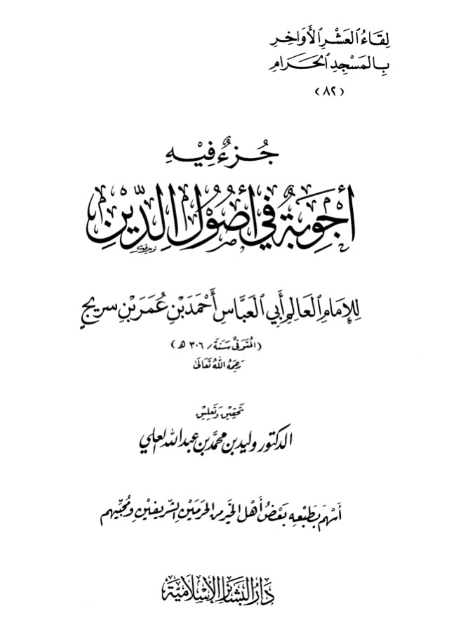 L’imâm, le Shaykh de l’islâm, le Juriste des irakiens Abû Al ‘Abbâs Ahmad Ibn ‘Omar Ibn Surayj Al Baghdâdî, Le Qâdî Shâfi’îte, auteur de compilations.