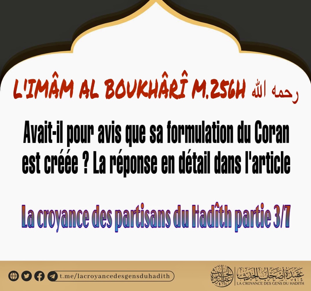 Cette affaire est donc problématique, et Ahmed Ibn Hanbal et d’autres que lui ne voient pas comme obligatoire le fait de s’y aventurer, AVEC LE FAIT QU’AL BOUKHÂRÎ QU’ALLAH LUI FASSE MISÉRICORDE N’A PAS ÉCLAIRCI CELA ET N’A PAS DIT NON PLUS « NOS FORMULATIONS DU CORAN SONT CRÉÉES » MAIS IL A PLUTÔT DIT « NOS ACTIONS SONT CRÉÉES » et ce qui est lu, ce qui est récité ceci est La Parole d’Allah Exalté Soit-Il et ce n’est pas créé. Et l’observation du silence concernant le développement de ces expressions est plus sain pour l’homme.