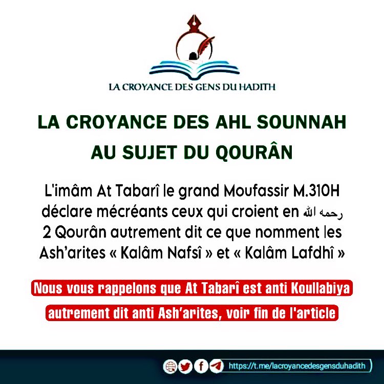 Notes personnelles : At Tabarî déclare mécréants ceux qui croient en 2 coran notamment ceux qui disent que celui-ci que nous avons qu’Allah a révélé est créé, c’est exactement ce qu’ils disent. Le coran n’est autre que ces 114 sourates, ces versets, ces paroles et ces lettres qui y figurent tout ceci est La Parole d’Allah incréée alors que pour les Ash’arites ceci est une interprétation du soi-disant vrai coran qu’ils ont inventé dans l’être d’Allah. Qui est sur la croyance des partisans du Hadîth qui constituent le groupe sauvé des 73 sectes ? Les Ash’arites ou bien nous ?