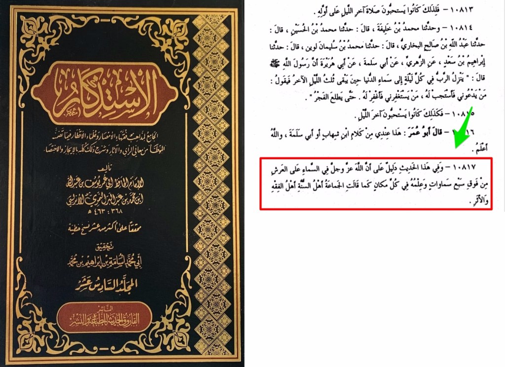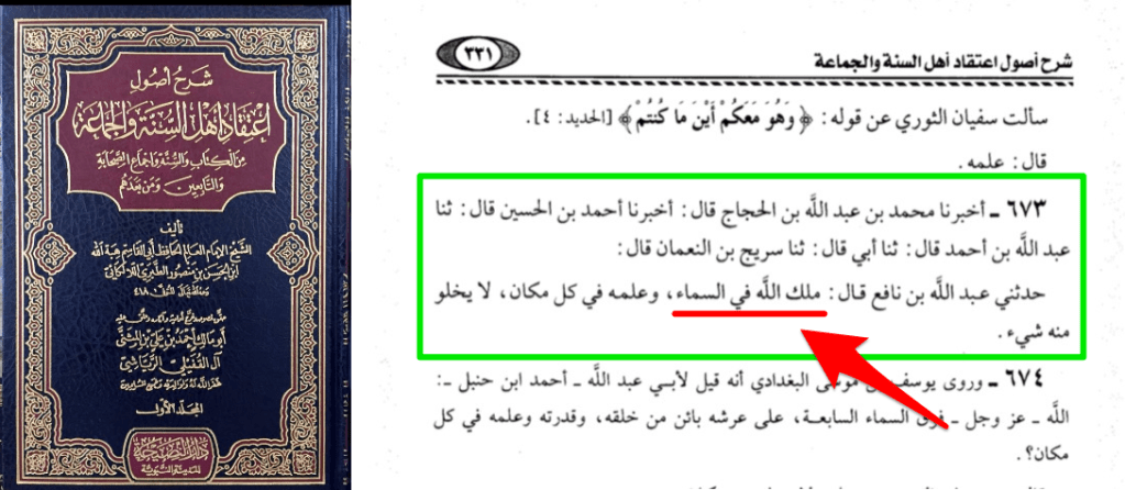 Ces derniers prétendent que l’imâm Ahmed et Al Lâlakâî ont rapporté une autre version disant que ce n’est pas Allah mais Sa Royauté qui est au ciel. Selon la version d’Al Lâlakâî d’après eux, ce serait ‘Abdoullah Ibn Nâfi’ lui-même qui aurait dit cela et non Mâlik.