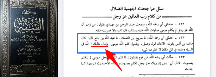 Si Soufyân At Thawrî et Ahmed sont cités avec Mâlik pour exposer la doctrine qu’Allah est au ciel, il apparaît clairement une fois de plus que Mâlik n’en fait pas exception et professe cette doctrine également donc pour finir ce point nous remettons ce qui est rapporté de lui authentiquement sans erreur de traduction :