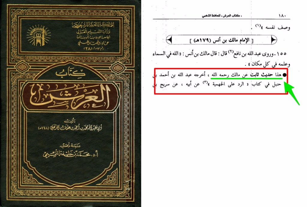L’imâm Ad Dahabî M.748H écrit concernant cette parole de Mâlik dans « Kitâb Al ‘Arch Volume 2 Page 170 📚 » :