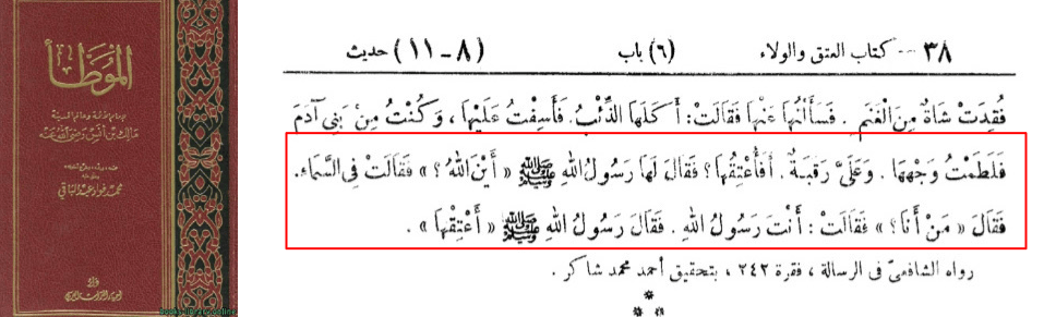 فَقَالَ لَهَا رَسُولُ اللهِ ﷺ أَيْنَ اللهُ؟ فَقَالَتْ فِي السَّمَاءِ. فَقَالَ مَنْ أَنَا؟ فَقَالَتْ أنتَ رَسُولُ اللهِ. فَقَالَ رَسُولُ اللهِ ﷺ : أَعْتِقْهَا.
