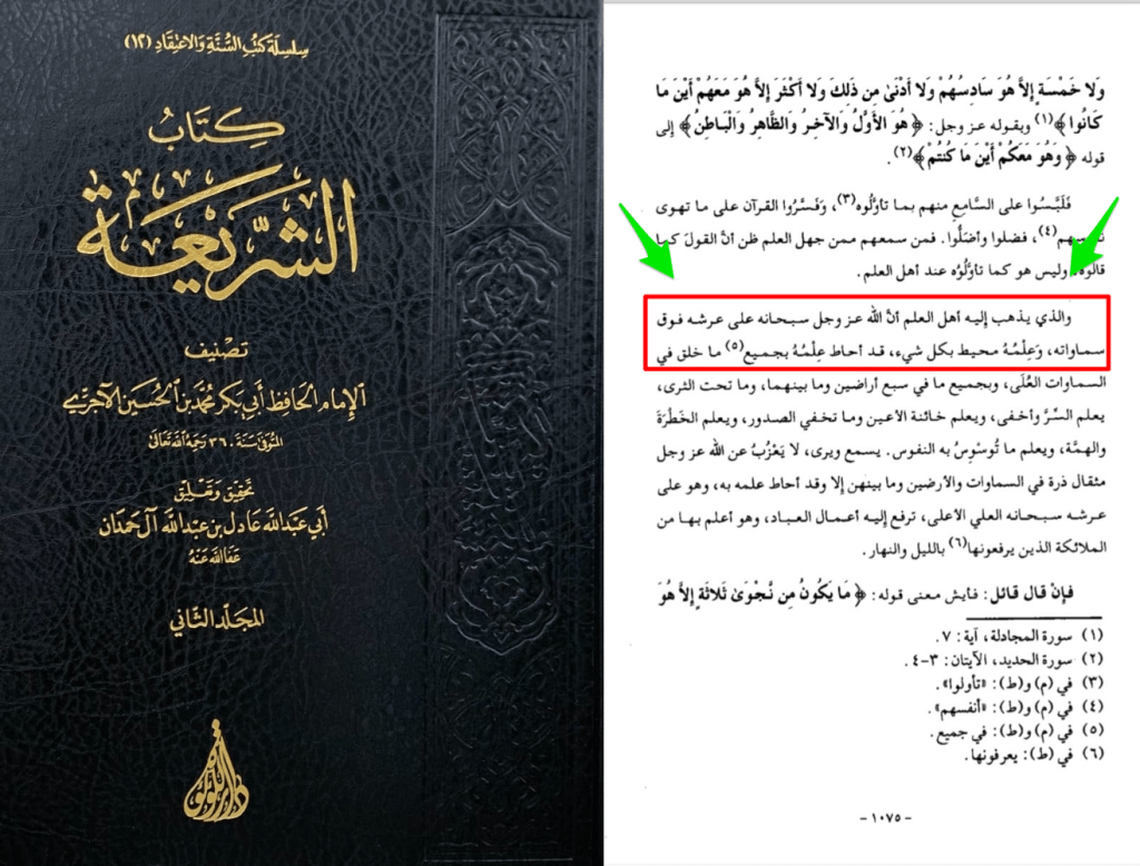 L’imâm Al Âjourî M.360H écrit dans « Ach Charî’ah Page 1075 📚 » avant de citer la parole de Mâlik disant qu’Allah est au ciel :