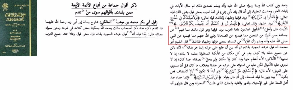 : وَأَمَّا قَوْلُهُ إِنَّهُ فَوْقَ عَرْشِهِ الْمَجِيدِ بِذَاتِهِ فَإِنَّ مَعْنَى فَوْقَ وَعَلَا عِنْدَ جَمِيعِ الْعَرَبِ وَاحِدٌ وَفِي كِتَابِ اللَّهِ وَسُنَّةِ رَسُولِهِ صَلَّى اللَّهُ عَلَيْهِ وَآلِهِ وَسَلَّمَ تَصْدِيقُ ذَلِكَ ثُمَّ سَاقَ الْآيَات فِي إِثْبَاتِ الْعُلُوّ وَحَدِيث الْجَارِيَة فَقَالَ، وَقَدْ تَأْتِي ( فِي ) فِي لُغَةِ الْعَرَبِ بِمَعْنَى فَوْقَ ؛ وَعَلَى ذَلِكَ قَوْلُهُ تَعَالَى : ( فَامْشُوا فِي مَنَاكِبِهَا ) يُرِيدُ فَوْقَهَا وَعَلَيْهَا ، وَكَذَلِكَ قَوْلُهُ تَعَالَى ( وَلَأُصَلِّبَنَّكُمْ فِي جُذُوعِ النَّخْلِ ) يُرِيدُ عَلَيْهَا ، وَقَالَ تَعَالَى : ( أَأَمِنْتُمْ مَنْ فِي السَّمَاءِ أَنْ يَخْسِفَ بِكُمُ الْأَرْضَ ) الْآيَاتِ ، قَالَ ( أَهْلُ ) التَّأْوِيلِ الْعَالِمُونَ بِلُغَةِ الْعَرَبِ يُرِيدُ فَوْقَهَا وَهُوَ قَوْلُ مَالِكٍ مِمَّا فَهِمَ عَنْ جَمَاعَةٍ مِمَّنْ أَدْرَكَ مِنَ التَّابِعِينَ مِمَّا فَهِمُوهُ عَنِ الصَّحَابَةِ رَضِيَ اللَّهُ عَنْهُمْ مِمَّا فَهِمُوهُ عَنِ النَّبِيِّ صَلَّى اللَّهُ عَلَيْهِ وَآلِهِ وَسَلَّمَ ( أَنَّ اللَّهَ ) فِي السَّمَاءِ بِمَعْنَى : فَوْقَهَا وَعَلَيْهَا ، فَلِذَلِكَ قَالَ الشَّيْخُ أَبُو مُحَمَّدٍ إِنَّهُ فَوْقَ عَرْشِهِ الْمَجِيدِ بِذَاتِهِ