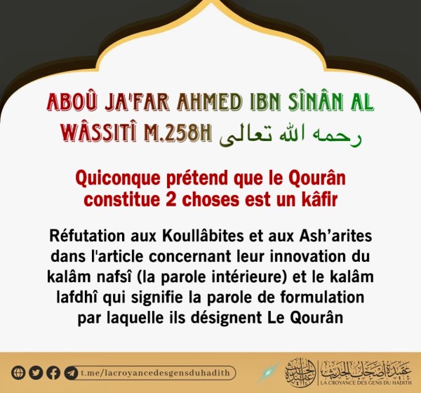 L’imâm Ahmed Ibn Sinân Al Wâssitî M.258H رحمه الله le Chaykh d’Al Boukhârî déclare mécréants ceux qui disent que le Qourân constitue 2 choses